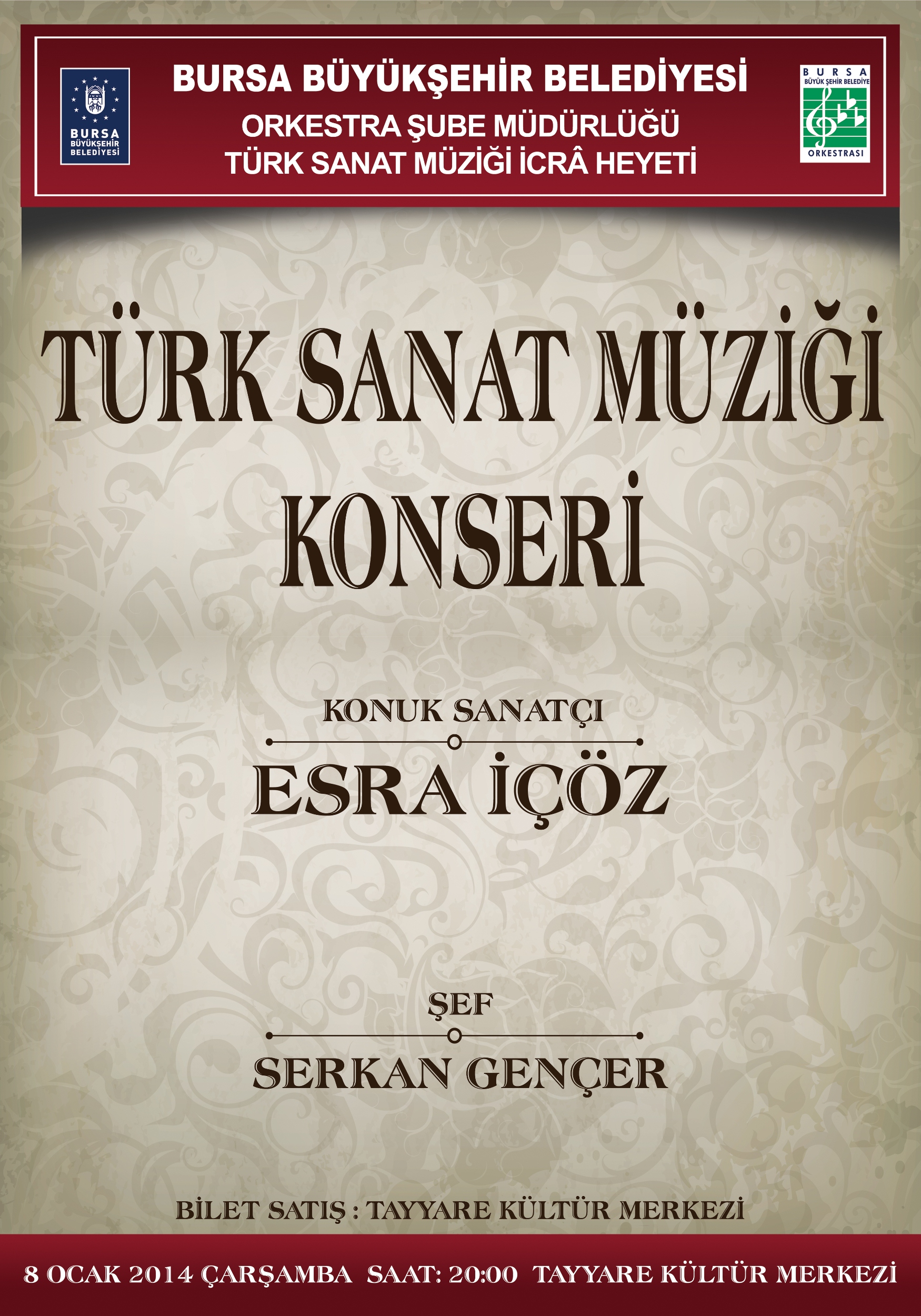 Bursa Büyükşehir Belediyesi Orkestrası Türk Sanat Müziği Bölümü’nün Ocak ayı konseri, 8 Ocak Çarşamba günü (BU AKŞAM) saat 20.00’de Tayyare Kültür Merkezi’nde gerçekleştirilecek.
